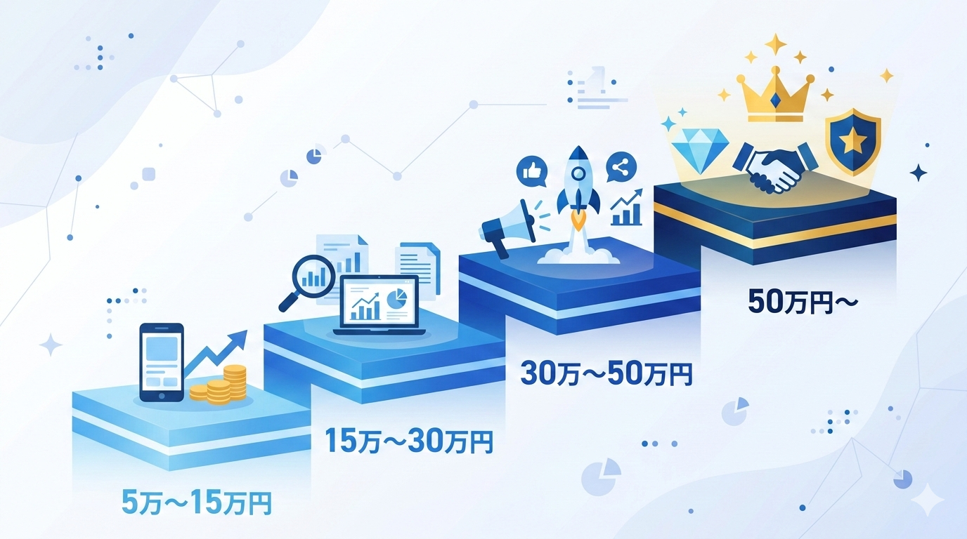 まず、多くの方が気になる「結局いくらかかるのか」について、料金帯ごとの相場を整理します。インスタ運用代行の費用は、大きく4つの料金帯に分かれます。